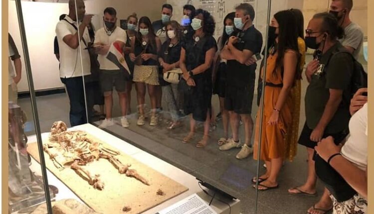 و داخل المتحف تم تقسيم الفوج المكون من ١١٤ سائح أسباني إلى ٦ مجموعات قاموا بجولة داخل قاعة العرض المركزي وقاعة المومياوات لمشاهدة روائع الحضارة المصرية العريقة، مشيدين بالاجراءات الاحترازية و ضوابط السلامة الصحية المطبقة في المنتجعات السياحية و المتاحف و المواقع الأثرية في مصر.