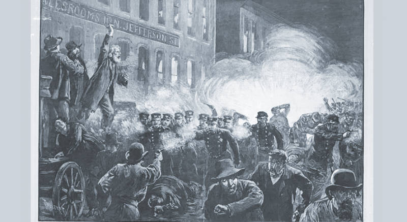 رداً على عنف الشرطة، نظم الأناركيون المحليون مظاهرة في ميدان هايماركت، حيث قتلت قنبلة أسقطها شخص مجهول في 4 مايو ستة من رجال الشرطة وجرحت حوالي خمسين شخصاً.
