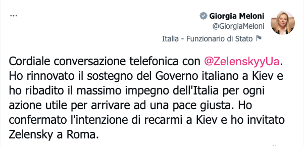 زيلينسكي . وجددت دعم الحكومة الإيطالية لكييف وأكدت من جديد التزام إيطاليا الأقصى بكل عمل مفيد للتوصل إلى سلام عادل.