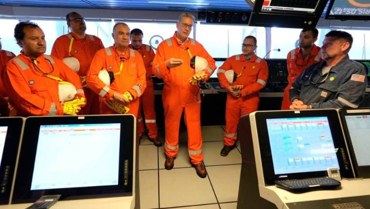 من على متن سفينة الحفر البحرية “Valaris DS-12″، تابع الوزير ومرافقوه أعمال الحفر البحري لبئرين تنمويين جديدتين في موقع غرب حقل غاز ريفين.