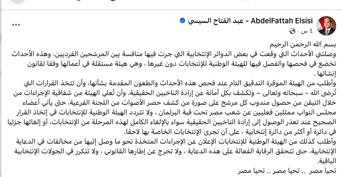 وقال الرئيس السيسي، في بيان نشره عبر صفحته الرسمية على موقع “فيس بوك”، إنه يطالب الهيئة الوطنية للانتخابات بالتدقيق الكامل عند فحص الأحداث والطعون المقدمة، واتخاذ القرارات التي تعكس إرادة الناخبين الحقيقية “بكل أمانة ورضا لله سبحانه وتعالى”.
