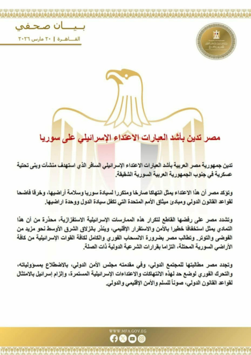 وقال الدكتور مهران في تصريحات صحفية، إن البيان المصري يتميز بوضوح قانوني وسياسي نادر، موضحاً أن وصف الاعتداء الإسرائيلي بأنه انتهاك صارخ ومتكرر لسيادة سوريا وسلامة أراضيها وخرق فاضح لقواعد القانون الدولي يضع الانتهاك في إطاره القانوني الصحيح، مؤكداً أن تشديد مصر على أن هذا التعدي يمثل استخفافاً خطيراً بالأمن والاستقرار الإقليمي وينذر بانزلاق الشرق الأوسط نحو مزيد من الفوضى والتوتر يعكس إدراكاً استراتيجياً عميقاً بأن سوريا ليست الهدف الوحيد بل جزء من استراتيجية أوسع.