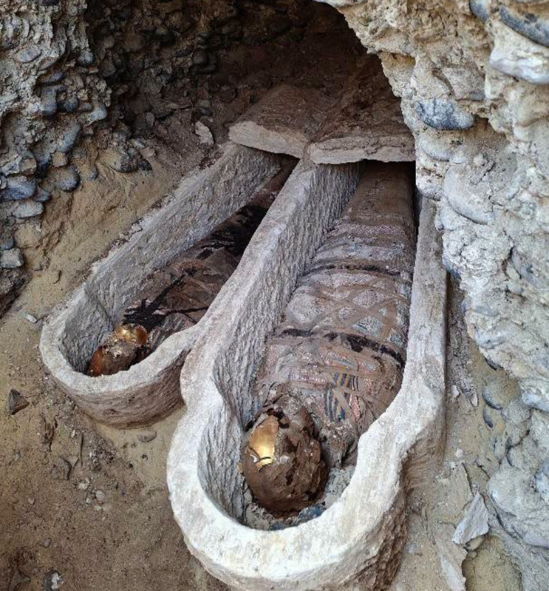 وأسفرت الحفائر عن العثور على عدد من المومياوات تعود للعصر الروماني، بعضها ملفوف بلفائف مزخرفة بزخارف هندسية، إلى جانب توابيت خشبية، وثلاثة ألسنة ذهبية وآخر من النحاس، فضلاً عن آثار لاستخدام رقائق الذهب على بعض المومياوات.