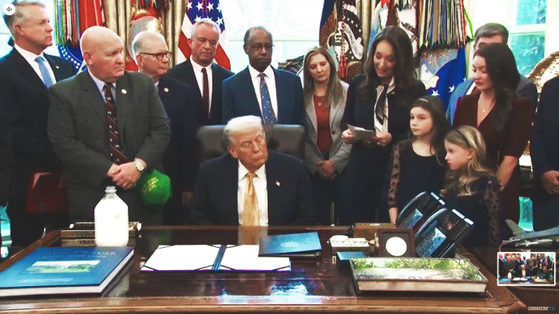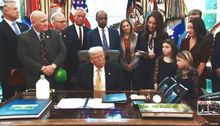 وجاء المشهد داخل المكتب البيضاوي، حيث جلس ترامب على مكتبه بينما كانت وزيرة الزراعة بروك رولينز تشرح تفاصيل القانون الجديد، إلى جانب وزير الصحة روبرت ف. كينيدي جونيور ووزير الإسكان السابق بن كارسن.